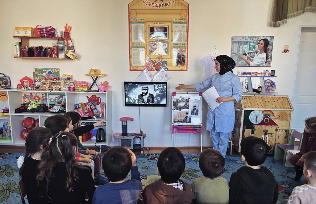 26.12.2023Социальный педагог Дудуркаева Хадижат Султановна провела беседу с детьми о жизни и наследии Устаза Кунта-Хаджи Кишиева (да будет возвышена его святость)